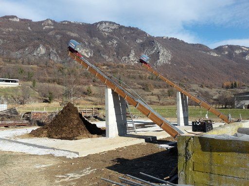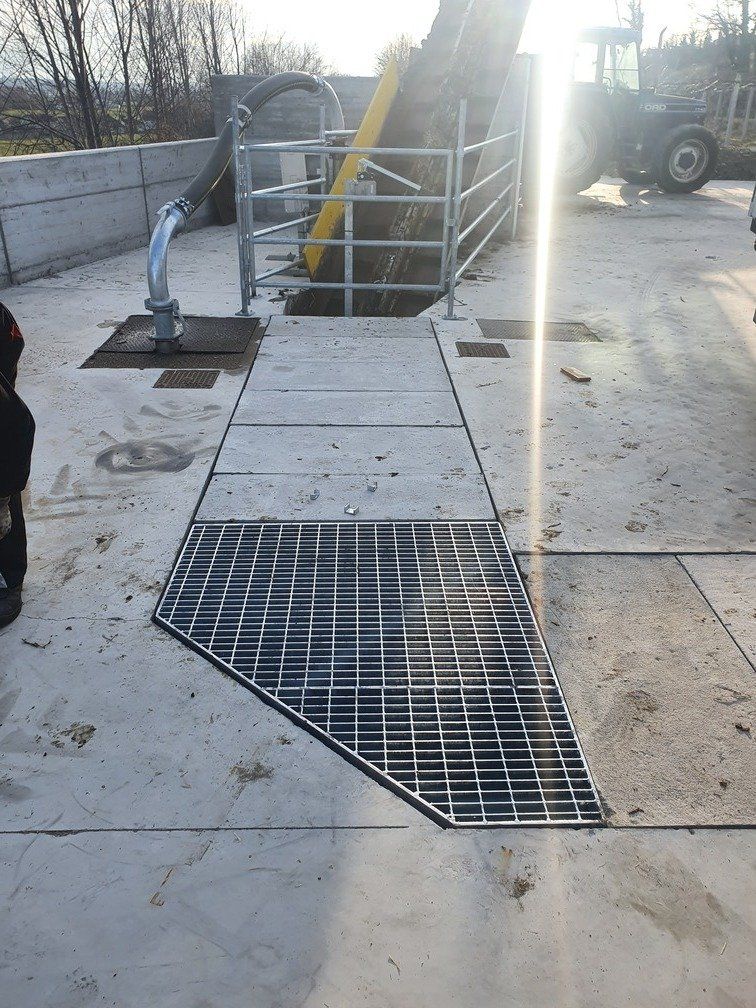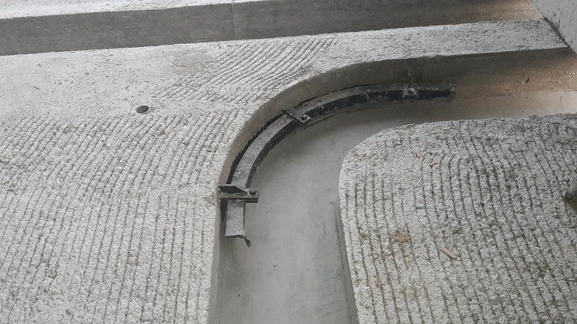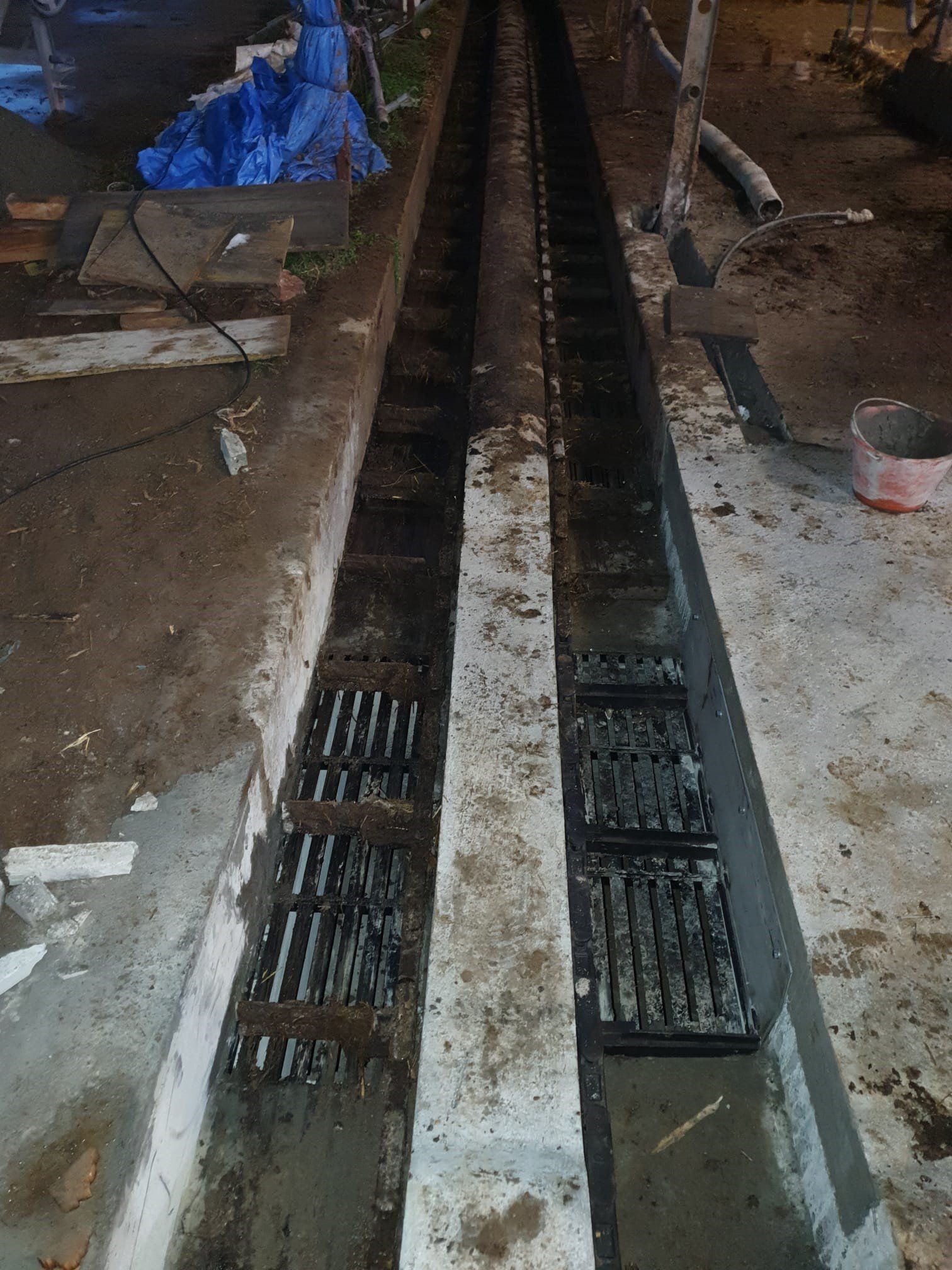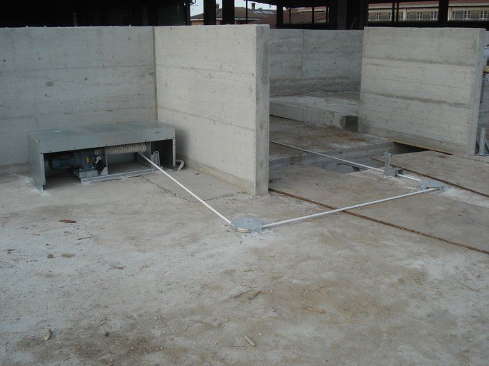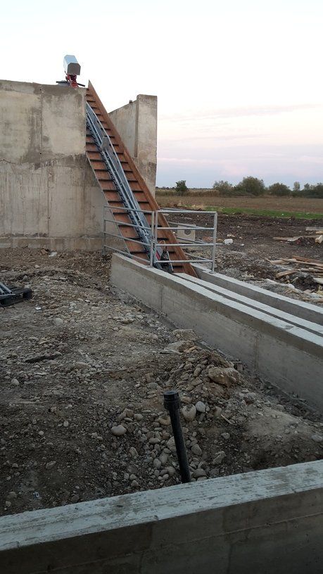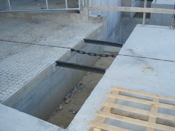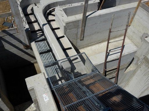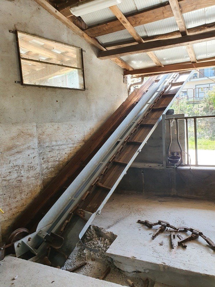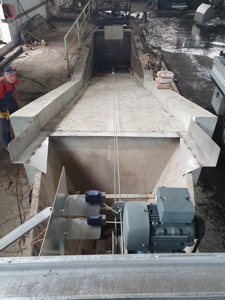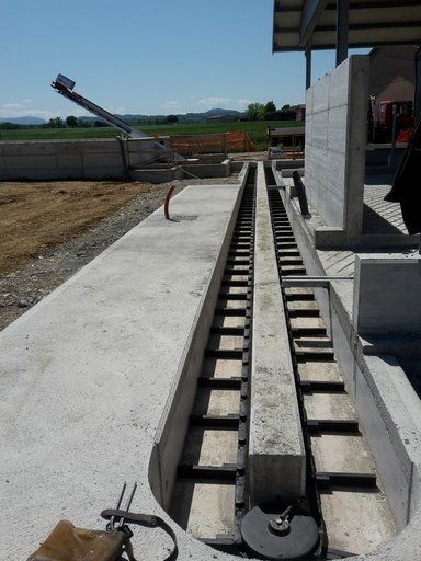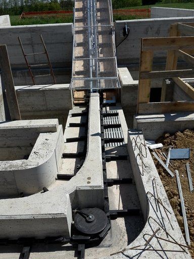 La chaîne passe à l'intérieur d'un canal en béton, dans lequel les broches et les courbes produites par nous sont murées, de manière à pouvoir faire tourner la chaîne à l'intérieur de la grange.
