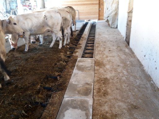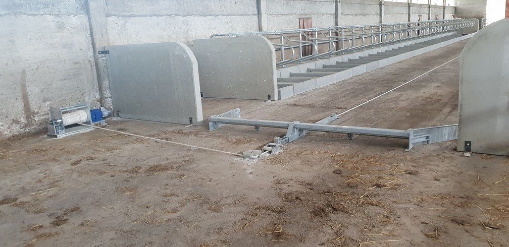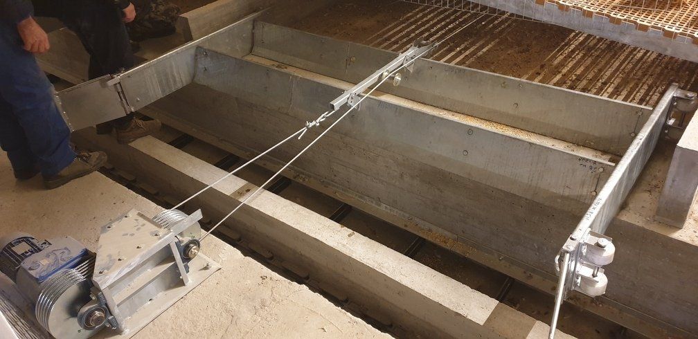 Cette installation est composée de deux unités de remorquage qui, au moyen d'une corde en polyester à haute ténacité, génèrent alternativement le mouvement des lames de raclage, qui transportent le lisier jusqu'au bout de l'étable. Disponible avec un panneau électronique qui détermine la fréquence de nettoyage et le calibrage du poids amovible. Ce type de système présente l'avantage de ne pas nécessiter de travaux de maçonnerie pour sa mise en place.