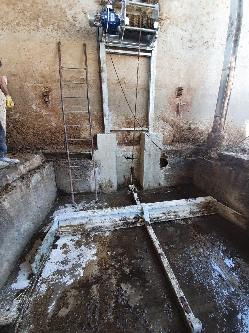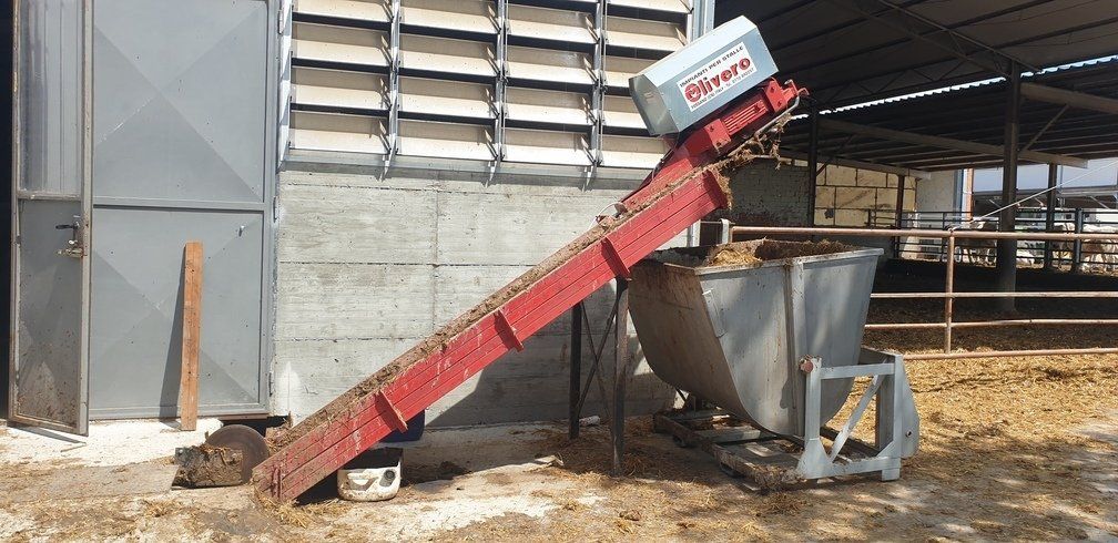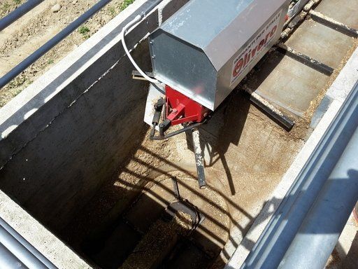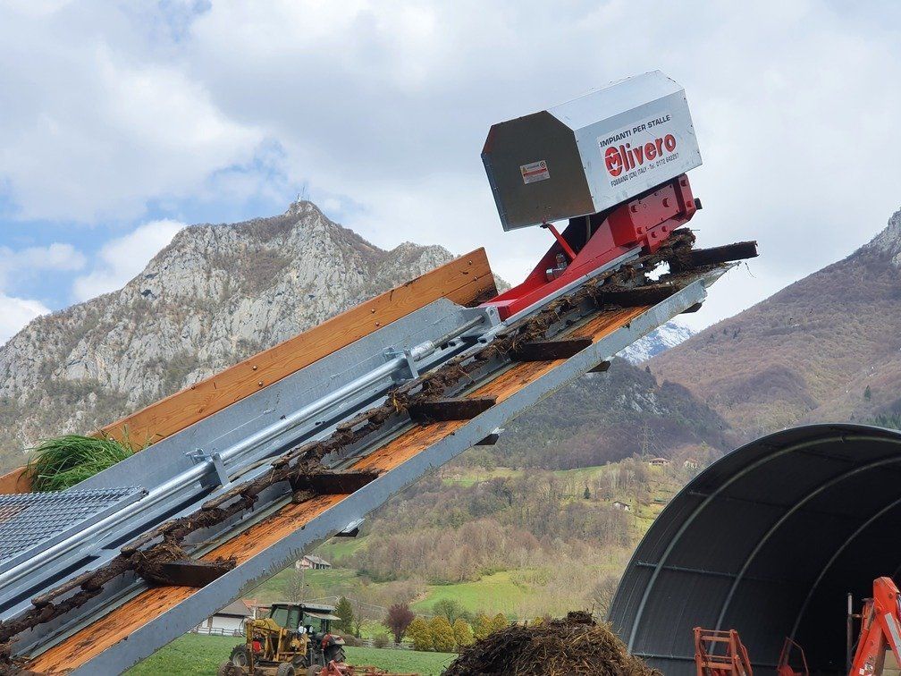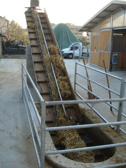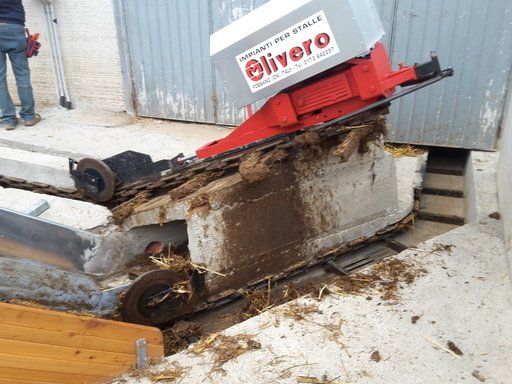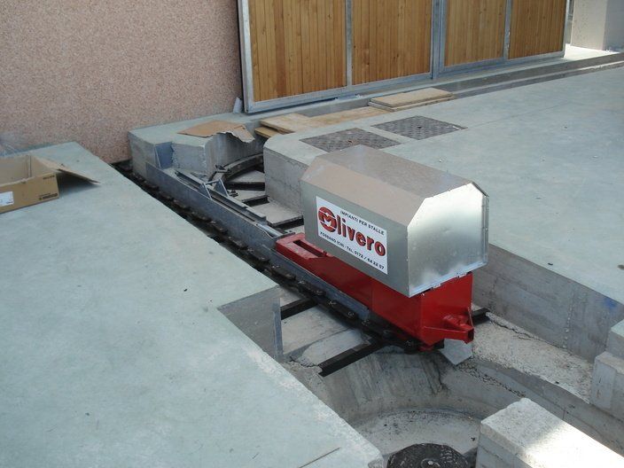 C'est un système en circuit fermé, nécessaire pour le nettoyage dans les étables de : bovins, chevaux, lapins, poulets et porcs. Le mouvement de la chaîne s'effectue au moyen d'un réducteur de taille appropriée, relié à un moteur électrique, la chaîne coulissant dans un canal transporte le fumier sur un élévateur qui atteint le sommet et le décharge sur un dumper ou dans un engrais.