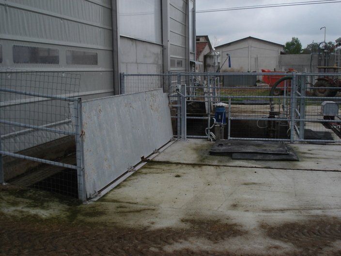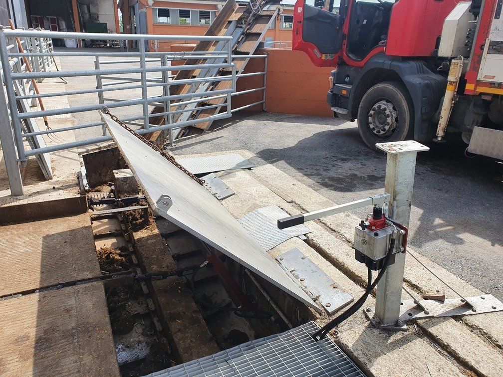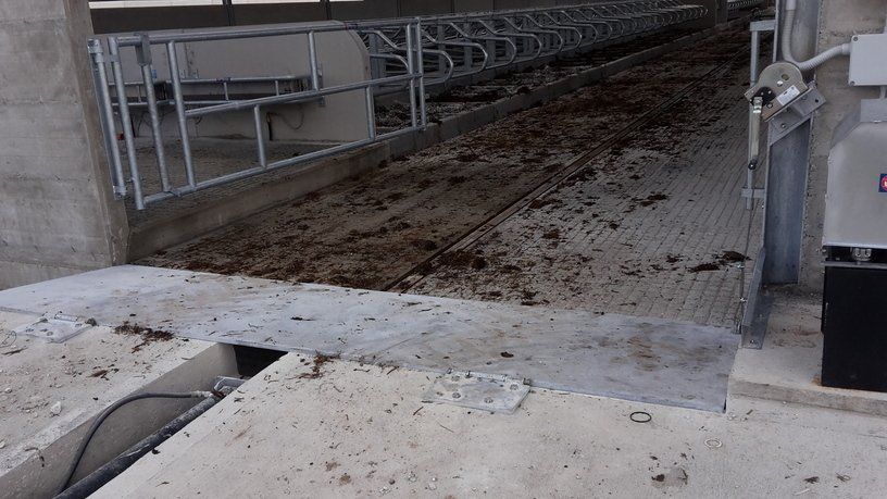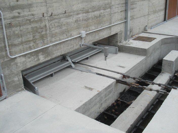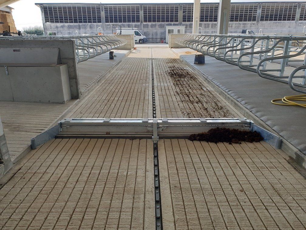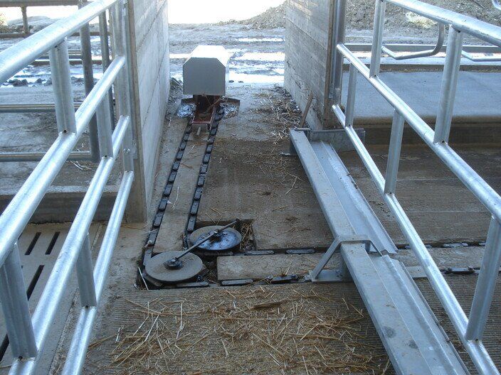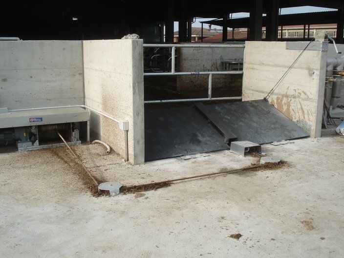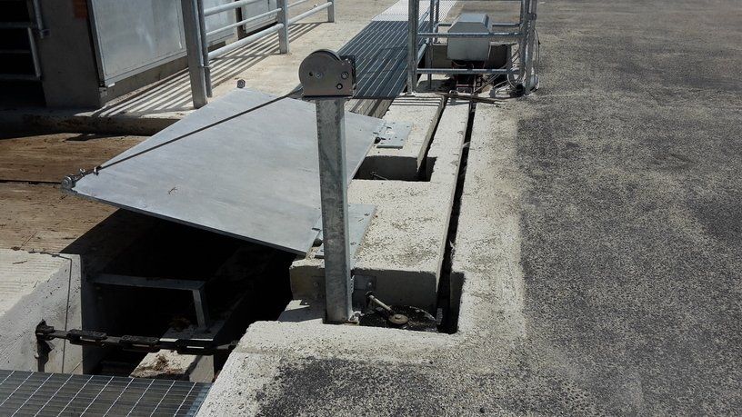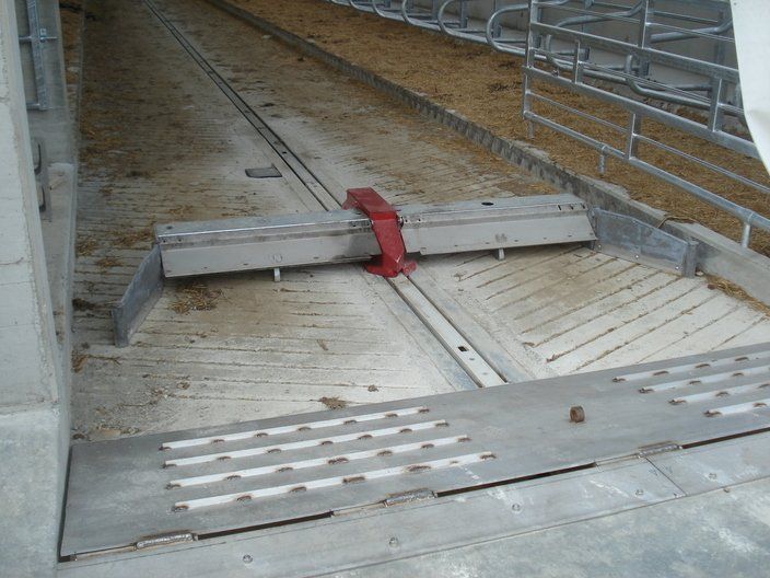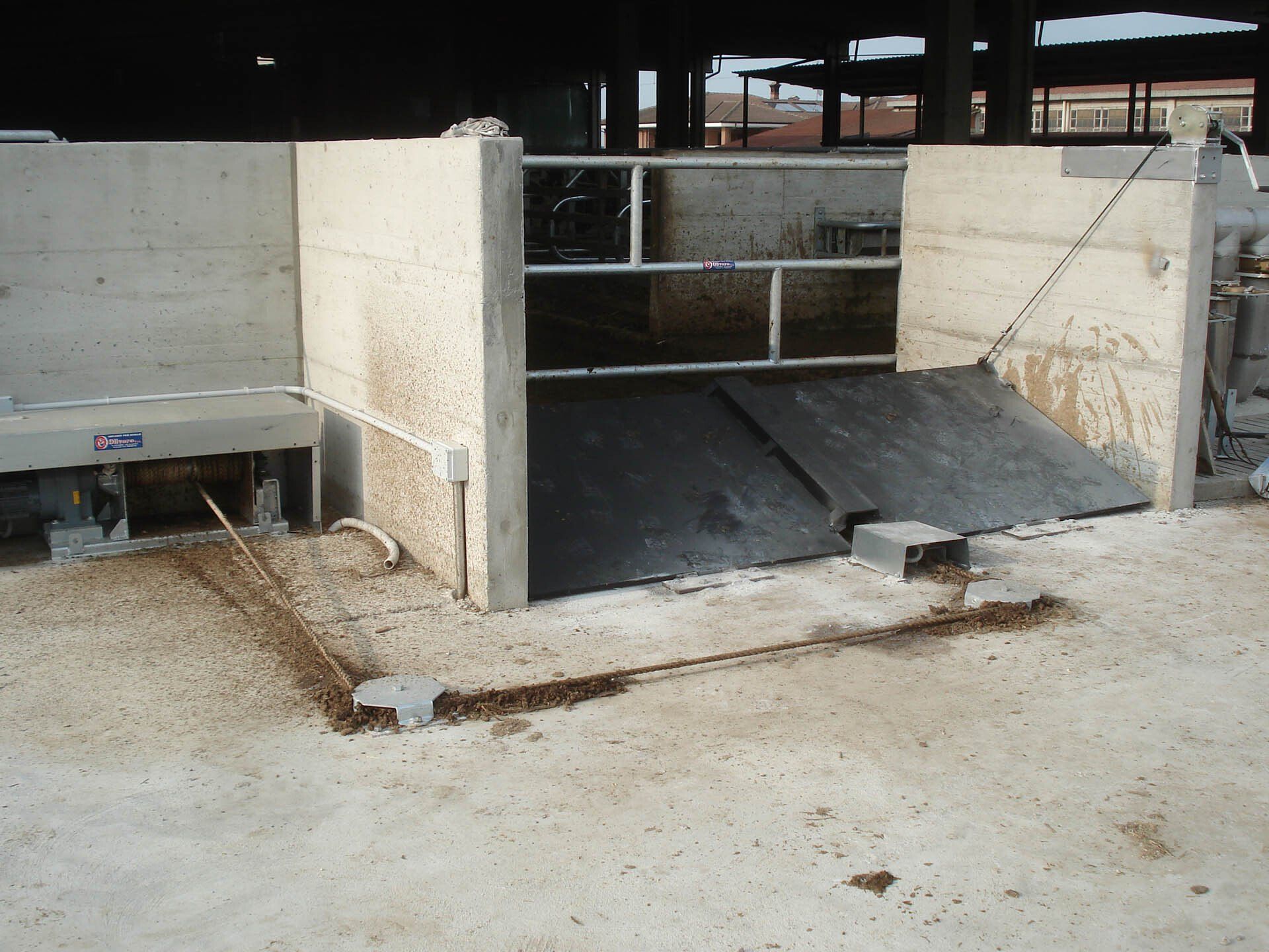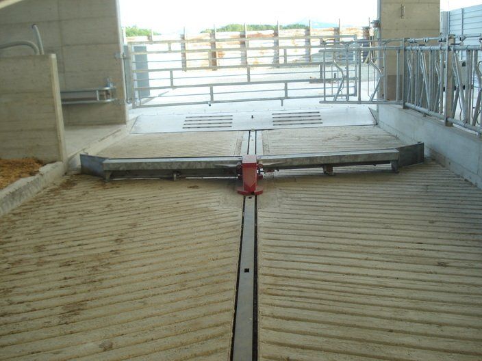 Ces feuilles, grâce à un système hydraulique ou varicello, permettent le passage des tracteurs lorsque le système de raclage est à l'arrêt, tandis que lorsqu'il est en fonctionnement, elles permettent au racleur de décharger le fumier dans le canal de l'éliminateur de fumier.