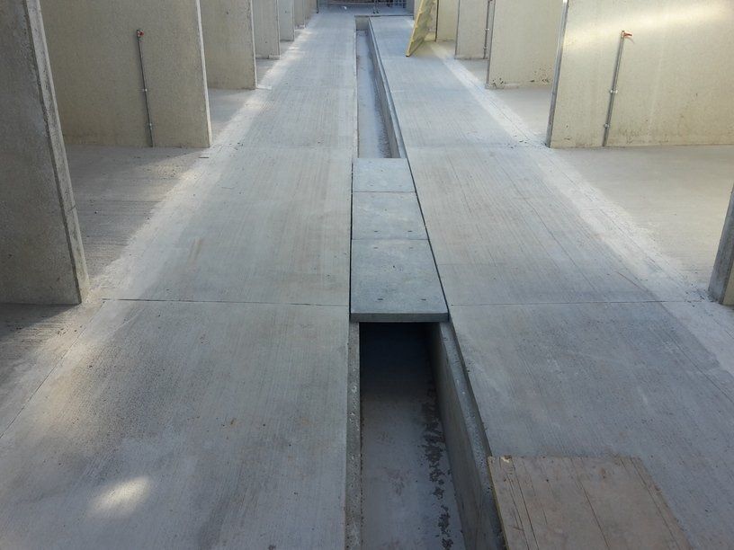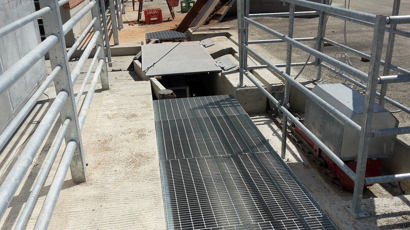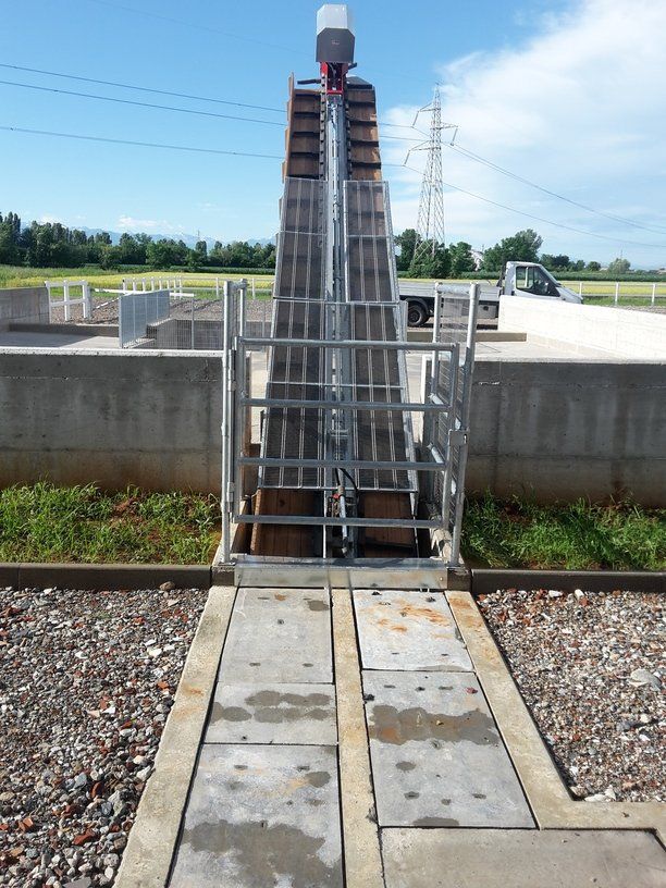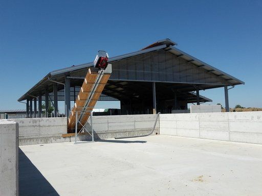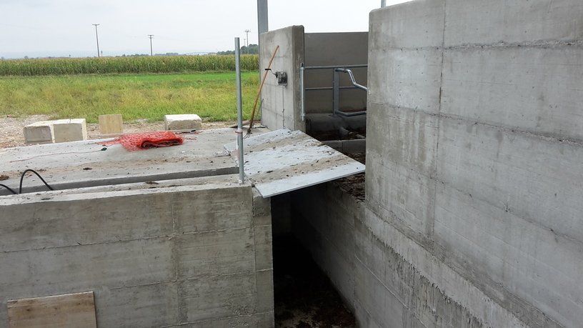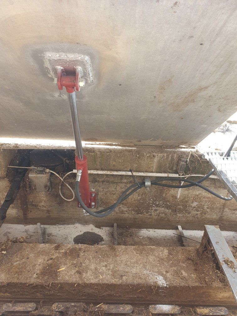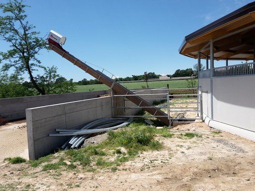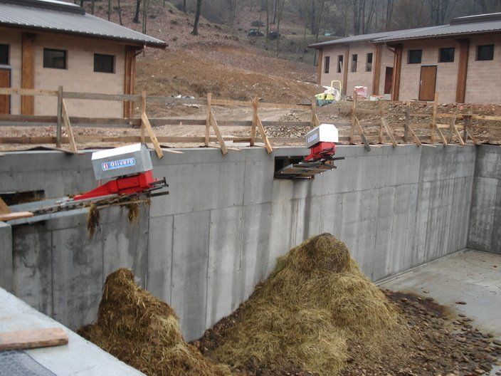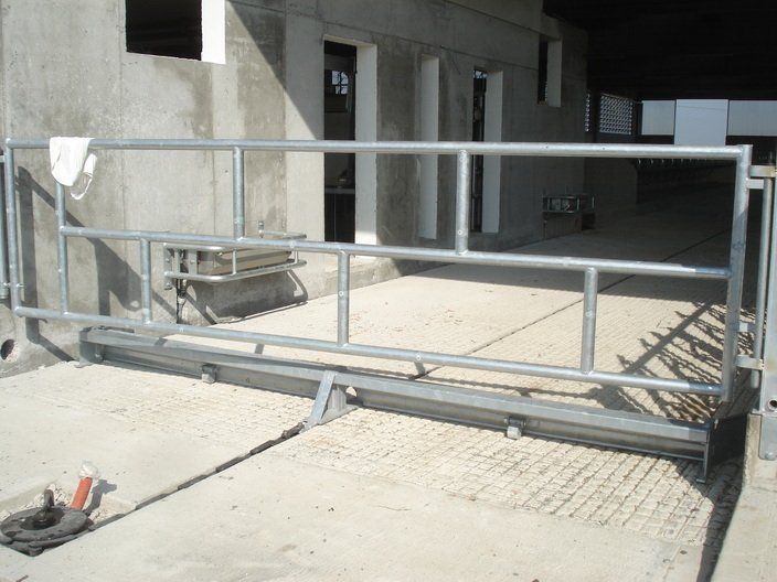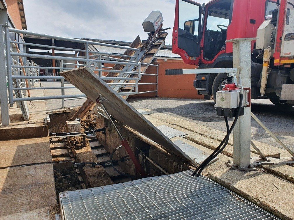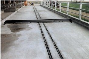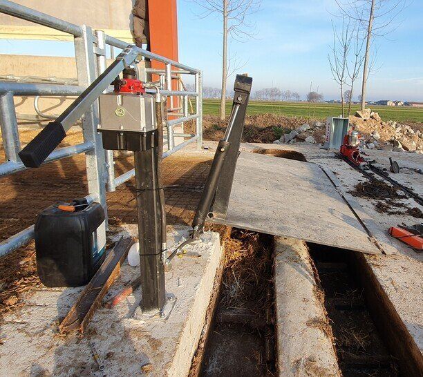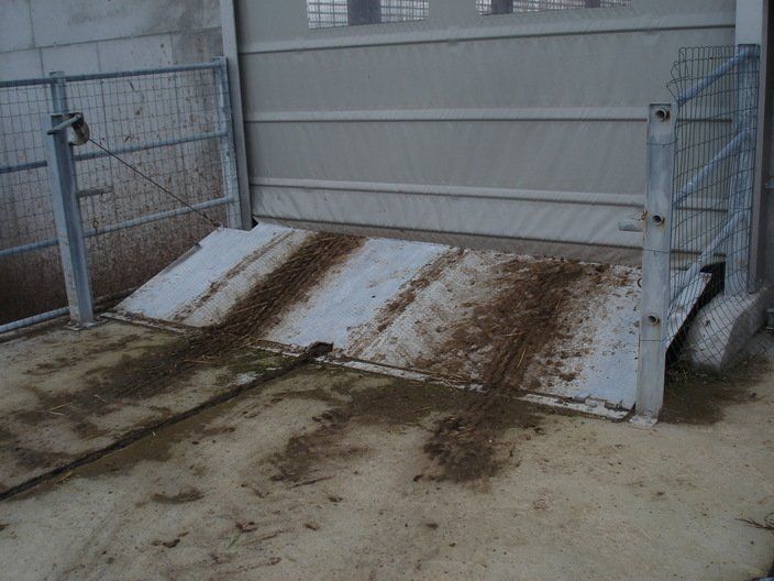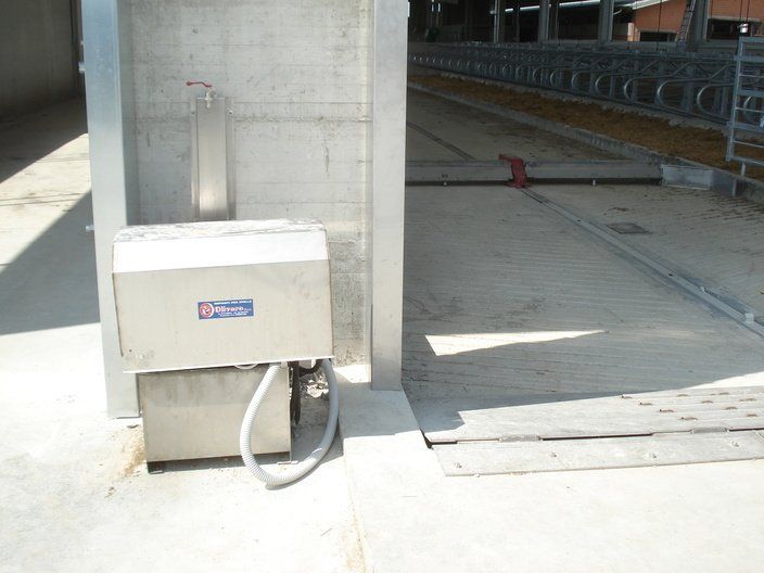 Ces feuilles, grâce à un système hydraulique ou varicello, permettent le passage des tracteurs lorsque le système de raclage est à l'arrêt, tandis que lorsqu'il est en fonctionnement, elles permettent au racleur de décharger le fumier dans le canal de l'éliminateur de fumier.